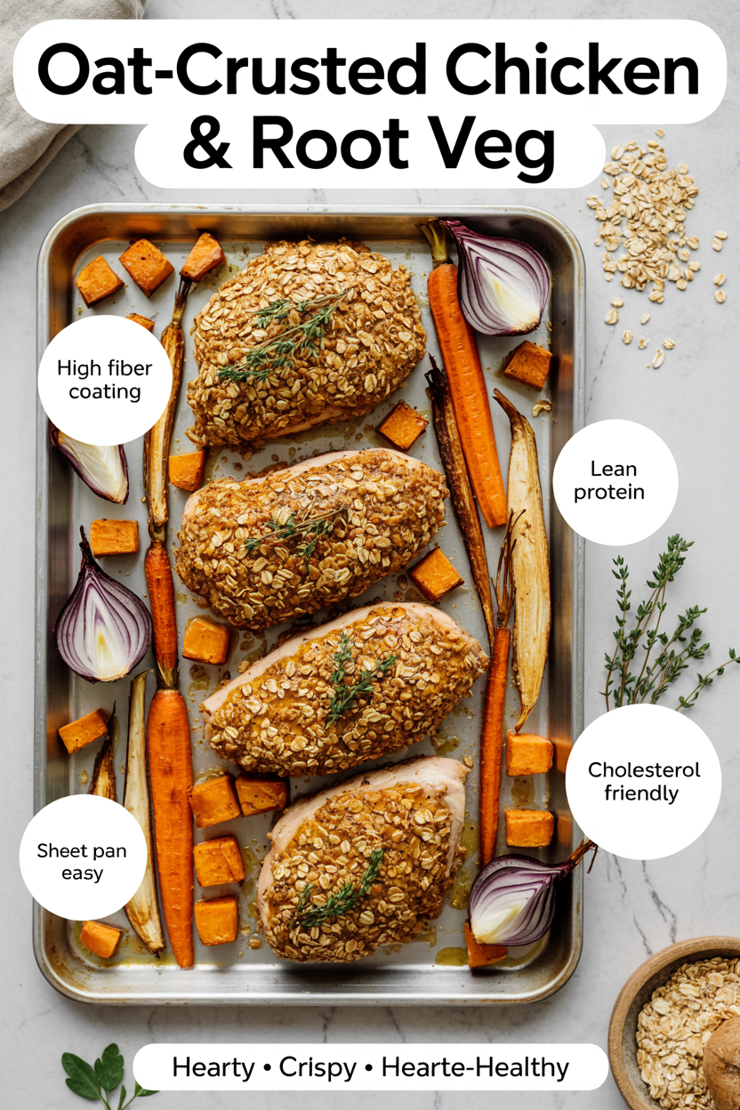 This recipe offers a creative and heart-healthy twist on classic breaded chicken. Instead of breadcrumbs, we use rolled oats to create a crispy crust that is packed with soluble fiber. Oats are a well-known cholesterol-lowering food, thanks to their high content of beta-glucan, a type of soluble fiber that has been shown to reduce LDL cholesterol. The roasted root vegetables add even more fiber and a wealth of vitamins and minerals.